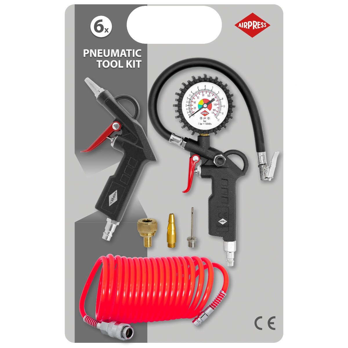 Komplektis 5-meetrine kiirliitega suruõhuvoolik, 3 erinevat otsikut, manomeetriga rehvipüstol, värvipüstol.
