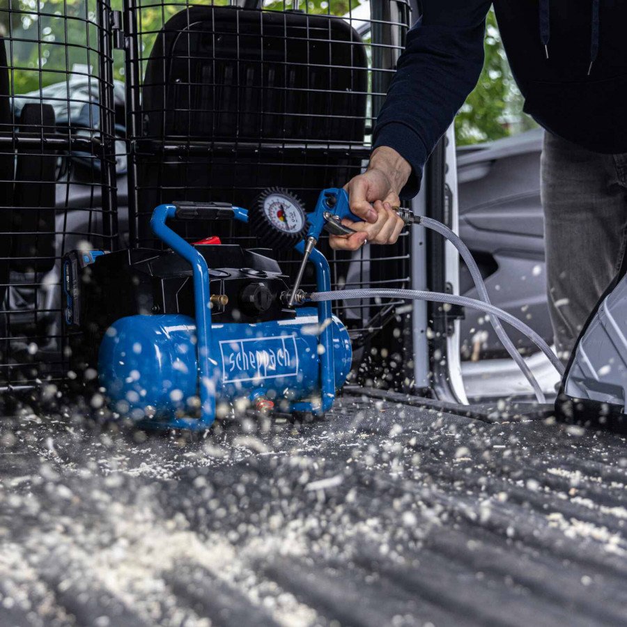 • Juhtmeta töö Scheppach IXES 20 V sarjaga – kõik selle süsteemi akud ja laadijad saab ühendada juhtmeta kompressoriga